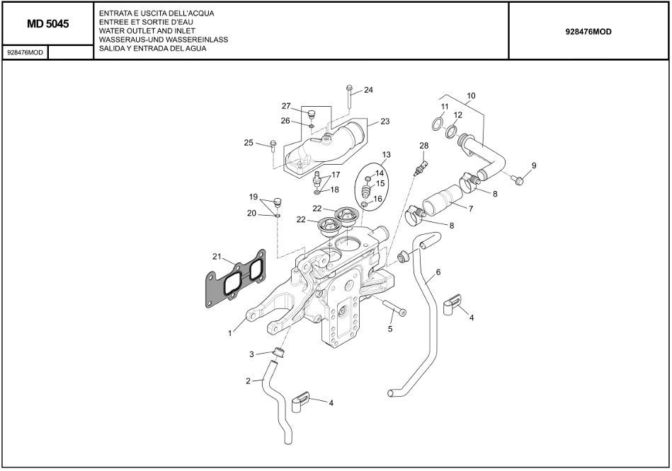 Item 28 Part No. 796417 MD5045 - WATER OUTLET AND INLET (928476mod) Name Remarks / Characteristi cs Qty 1 Machine applicability Sat Dec 21 08:39:01 UTC 2024 Coolant temperature sensor