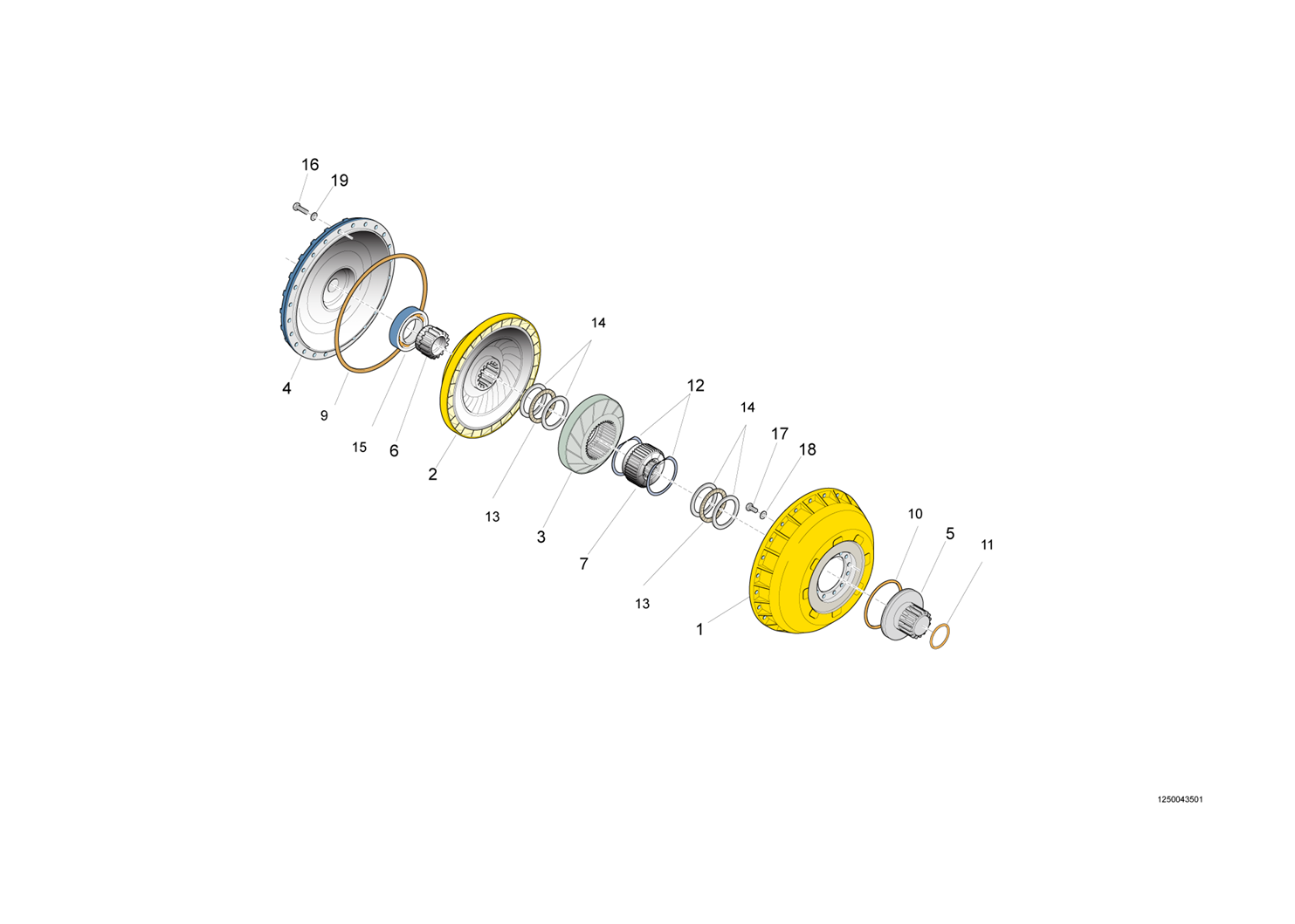 項(xiàng)目零件號名稱數(shù)量備注再制造件號L COMPLETE _ASSEMBLY 5541389100 CONVERTER 1 CONVERTER ASSEMBLY 1 5541400300 IMPELLER 1 2 5541400400 TURBINE 1 3 5541400500 STATOR 1 4 5541400700 COVER 1 FONT COVER 5 5541924800 HUB 1 HUB, IMPELLER 6 5540982500 HUB 1 HUB, TURBINE 7 5540984000 HUB 1 HUB, STATOR, FIXED 8 5540980500 RETAINER 2 CLUTCH 9 5541398600 O-RING 1 10 5540978700 O-RING 1 11 5541401100 SEAL 1 12 5540980600 RETAINING RING 2 13 5541400100 BEARING 2 14 5541400600 THRUST WASHER 4 15 5541399000 BEARING 1 NEEDLE 16 5540975600 CAPSCREW 24 17 5540975500 SCREW 12 18 5540810500 WASHER 12 19 5541924700 WASHER 24